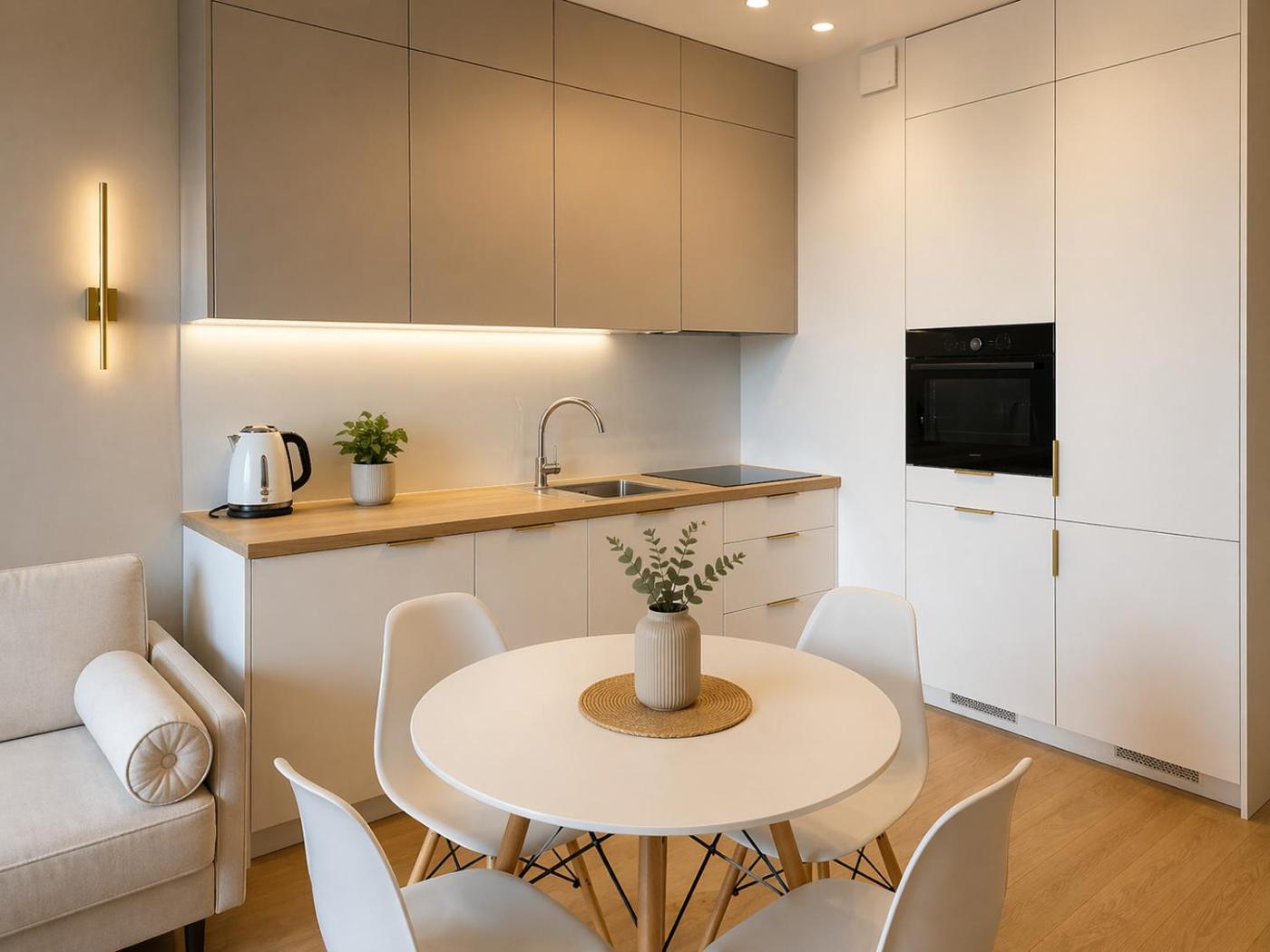 Oferta apartamentu obejmuje sypialnię (1), salon, aneks kuchenny z pełnym wyposażeniem, w tym lodówką i ekspresem do kawy, a także łazienkę (1) z prysznicem oraz suszarką do włosów. W apartamencie zapewniono ręczniki i pościel.